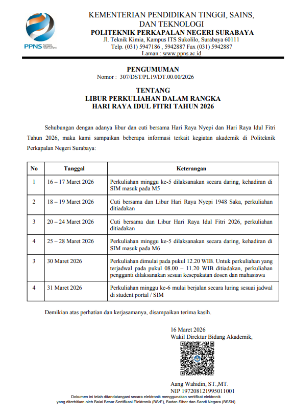 Dalam rangka memperingati hari raya umat Islam dan Hari Raya Nyepi, Politeknik Perkapalan Negeri Surabaya memberikan pengumuman yang berisi jadwal libur perkuliahan dalam rangka Hari Raya Idul Fitri dan Hari Raya Nyepi Tahun 2026 yang disampaikan oleh Wakil Direktur Bidang Akademik, Aang Wahidin, ST.,MT.